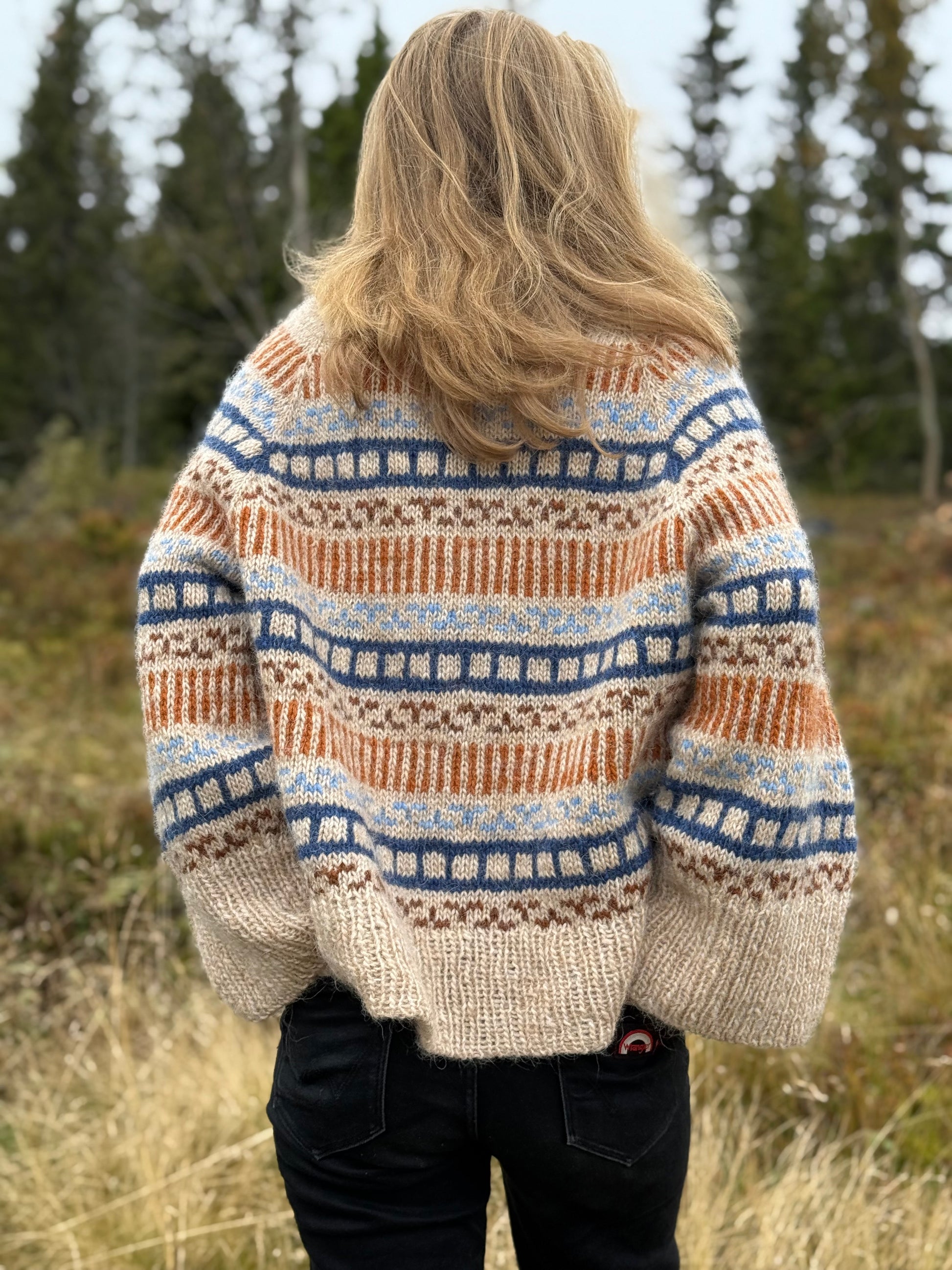 Worked from the top down with raglan increases. The neckline is shaped using short rows while working the initial increases. Then you switch to stranded colorwork following a chart. After completing the yoke, you separate for body and sleeves and continue working each part separately.