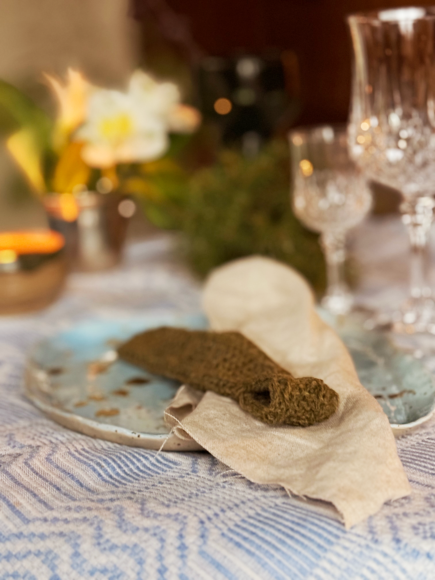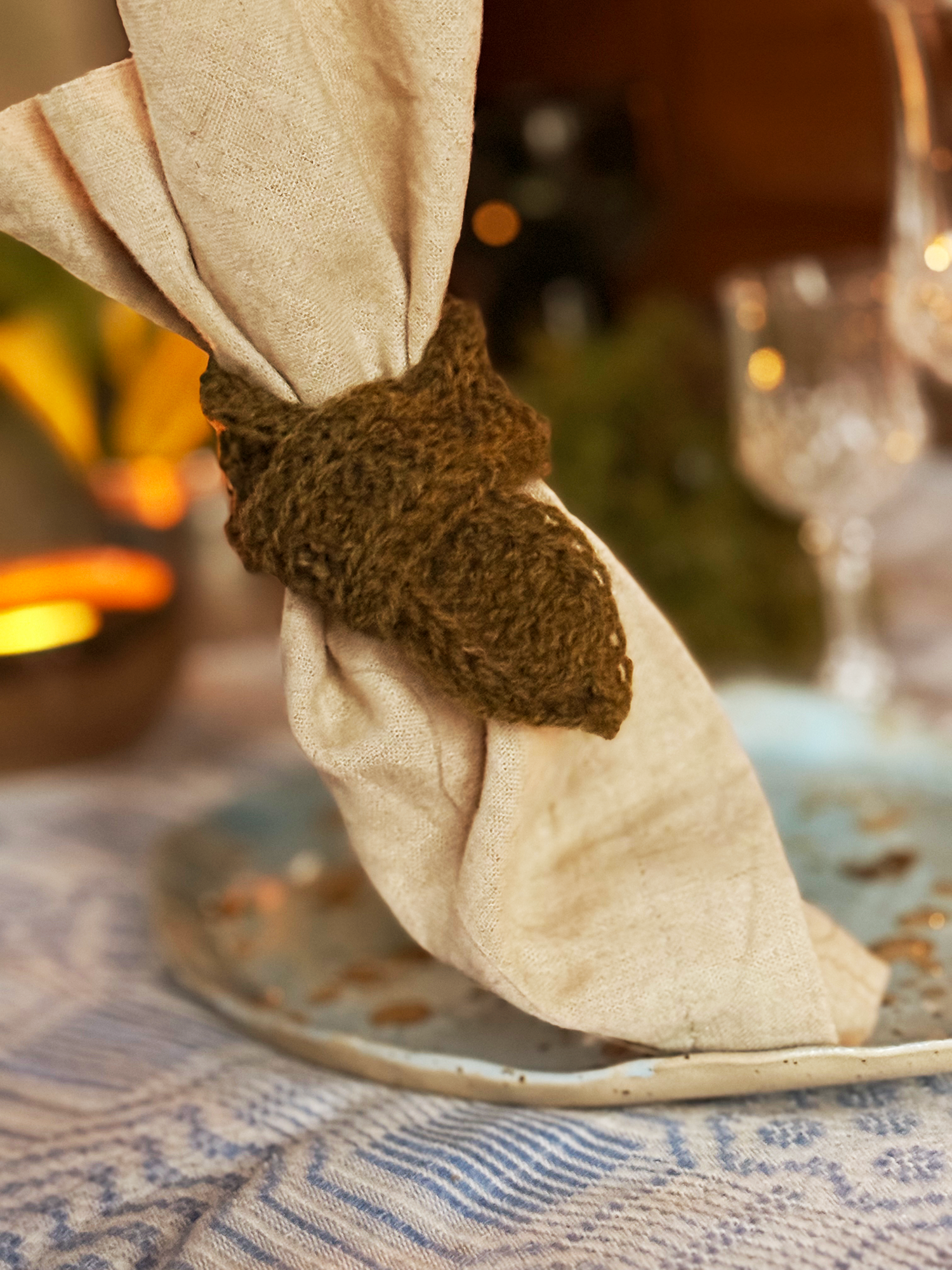 Prøv deg fram. Tjukkere garn vil gi en bred serviettring med statementuttrykk. Tynnere garn vil se mer elegant ut, og gi et mer eksklusivt preg. Du strikker bare så langt du vil, så størrelsen kan tilpasses.