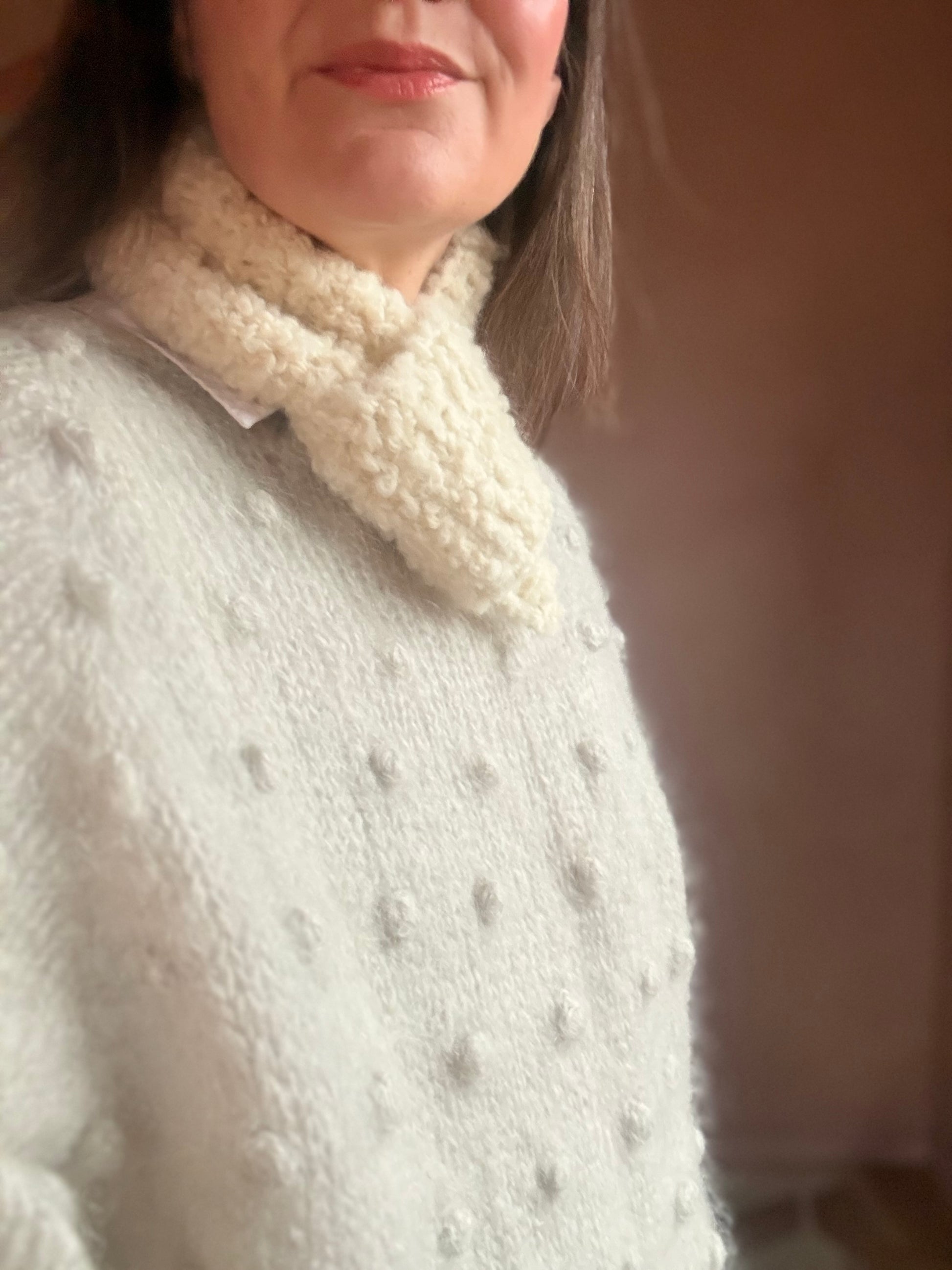 Skjerfet går en gang rundt halsen.Prøv deg gjerne fram for en annen form. Tjukkere garn vil gi et bredere skjerf, og oppskriften inneholder instruksjoner for både pinne 4,5 og pinne 8 mm. Tynnere garn vil se mer elegant ut, og gi et mer eksklusivt preg.